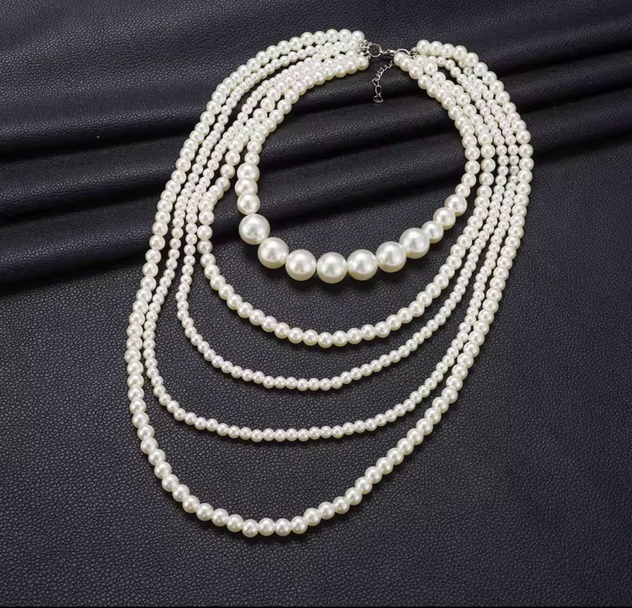 Collar blanco con 5 tipo de perlas diferentes tamaños